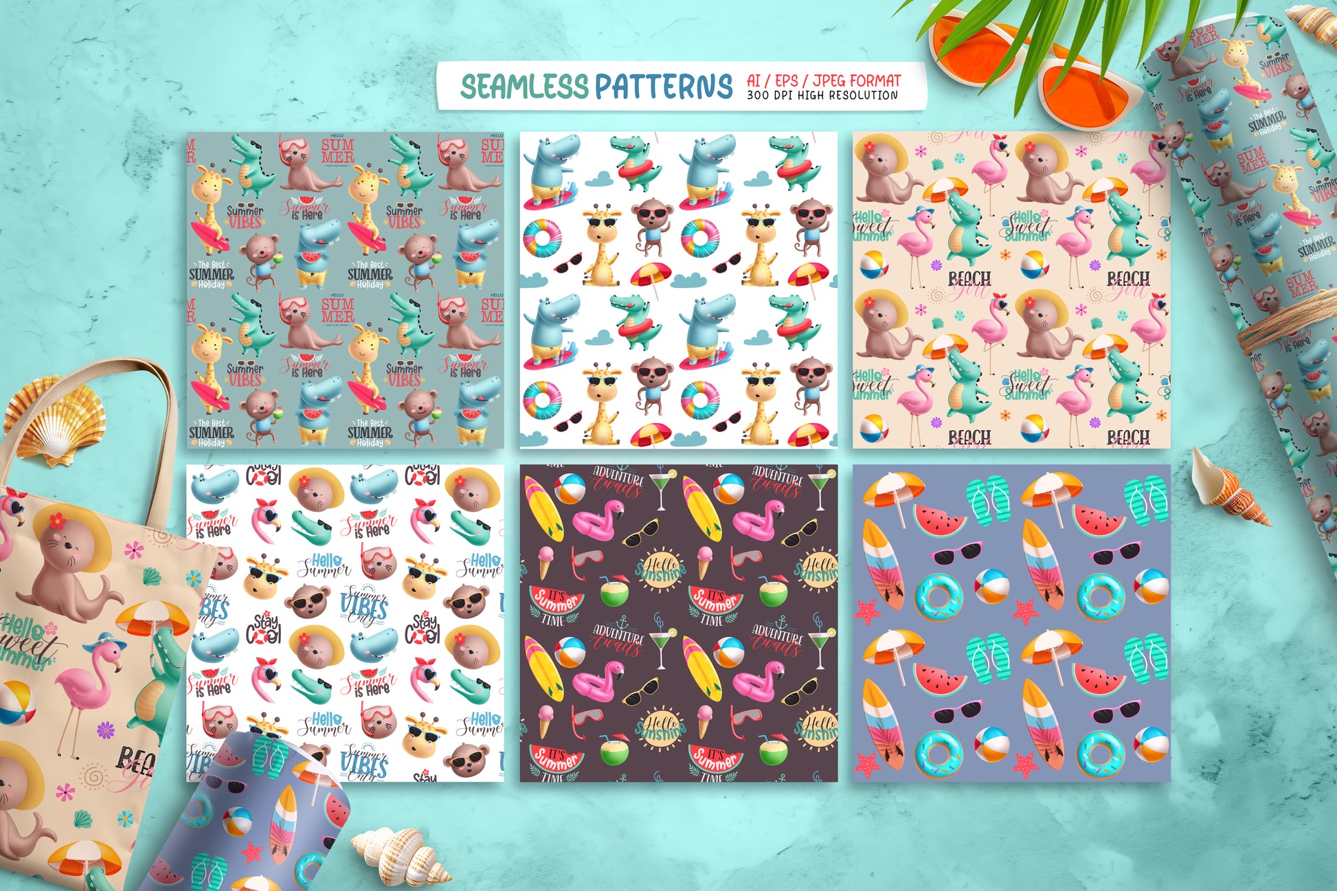 Summer beach animals illustration bundle with a variety of summer animal characters, summer beach-themed design elements, seamless patterns and pre-made poster designs. All elements in this bundle are in vector formats (AI or EPS) and raster format (PNG or JPG). You have the flexibility to use each element individually or combine them to create new designs both for kids and adults.
